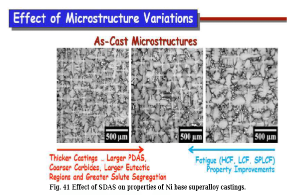 IN-713LC合金精铸涡轮叶片的微孔度随着二次枝晶的减少而降低手臂间距(SDAS)。孕育剂已显示出对降低孔隙率的作用,特别是在较高的模具温度下。孔隙存在于晶界和树枝状区域。由于SDAS比晶粒度,孔隙度被认为是SDAS的“加权平均”度量,而不是晶粒度大小。模具温度对孔隙率有重要影响,因为模具温度影响铸件的冷却速率,并因此影响其SDAS。模具温度高时SDAS相对较大,细化晶粒会降低“有效” SDAS,从而降低孔隙率含量。 SDAS影响镍基高温合金铸件的性能,如图41所示。
